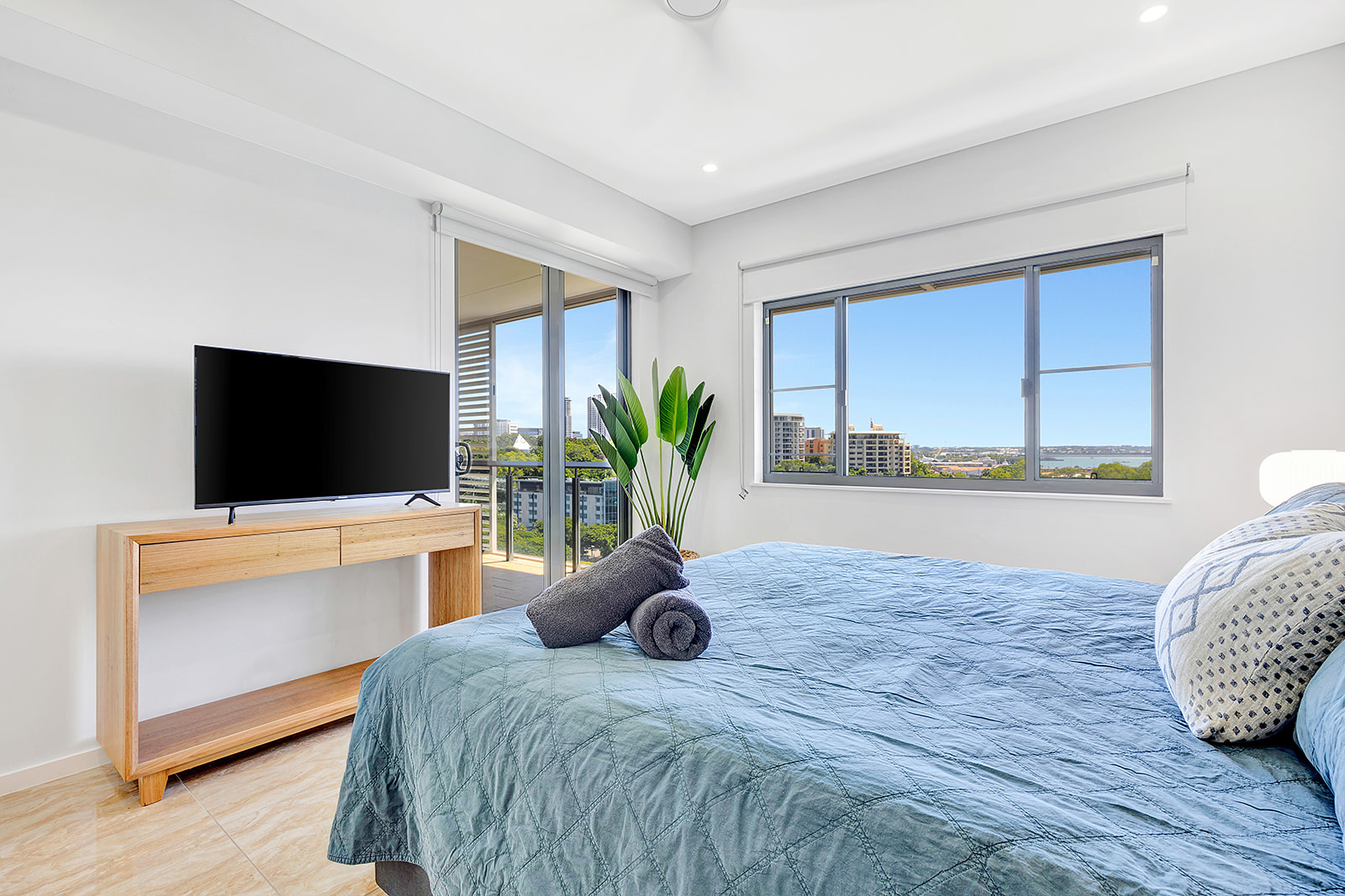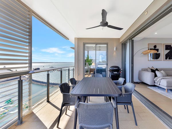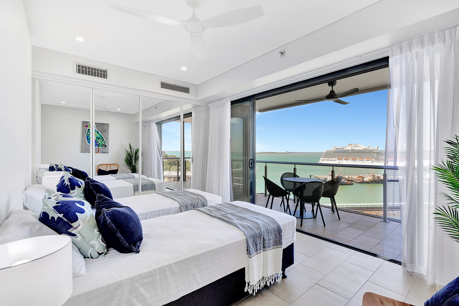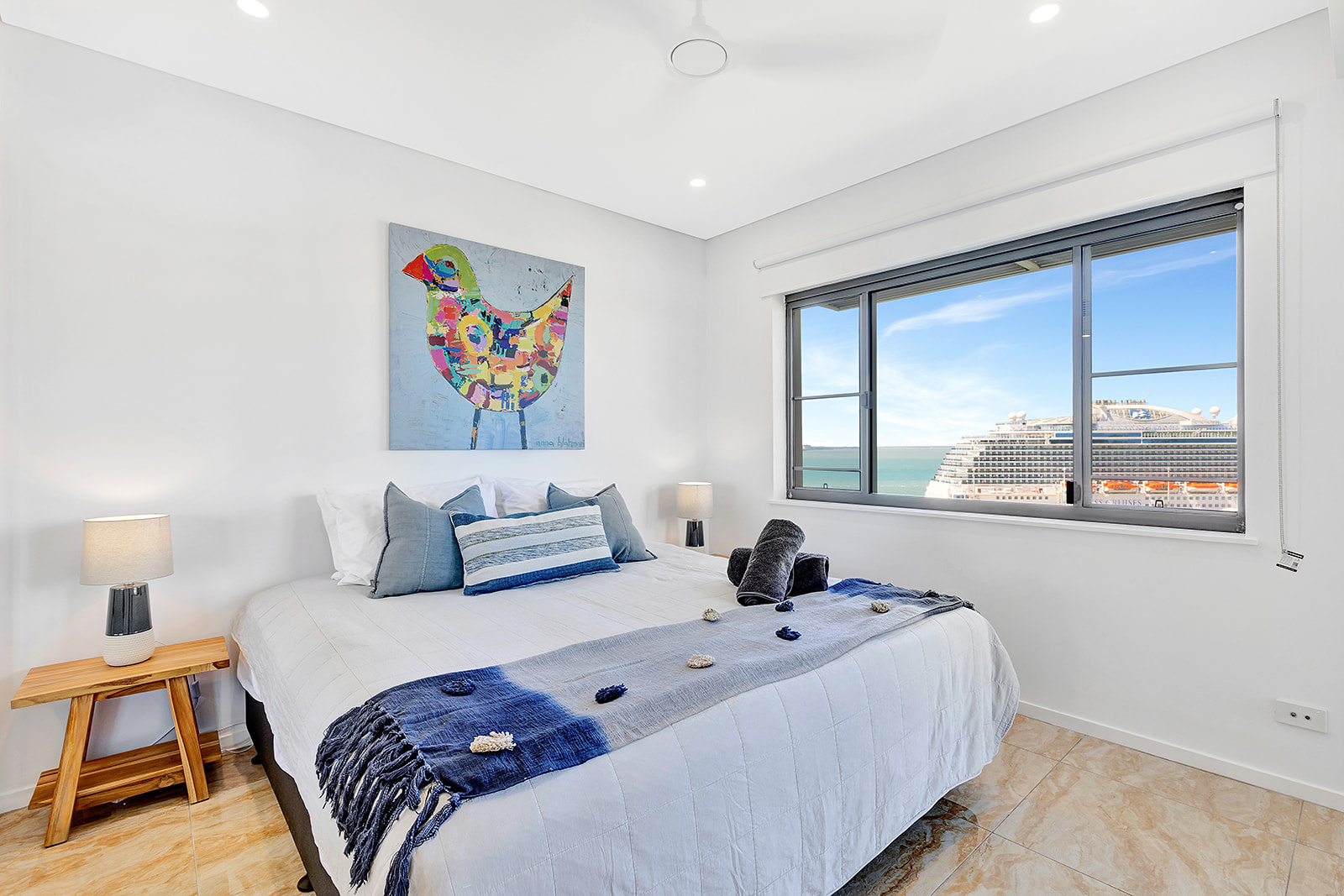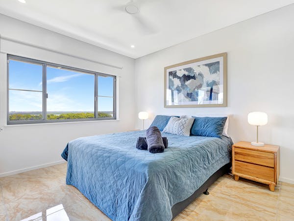 Located on the 7th floor offering 270-degree views over the Darwin Waterfront and the ocean as far as the eye can see. Upon entry the apartment opens to an elegant open-plan kitchen, dining, and lounge area with access to the fabulous breezy balcony and BBQ. The master bedroom enjoys these same views and includes queen bed, 2 x built-in robes, TV, private ensuite bathroom and sliding door to the balcony. The second bedroom offers the option of I x king or 2 x single beds, built-in robe and is adjacent to the second bathroom. An additional double sofa bed is available in the lounge. A separate laundry area, secure access and undercover secure parking completes the apartment.