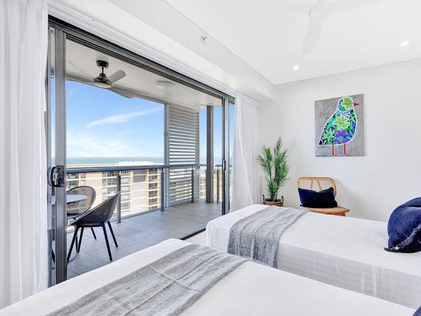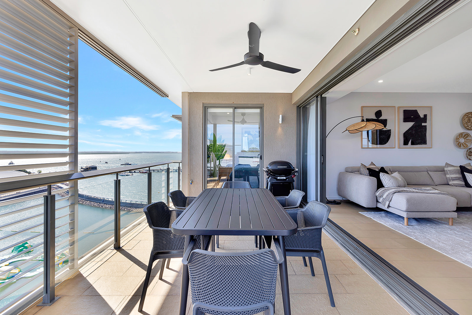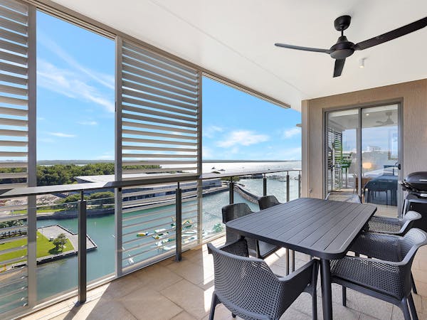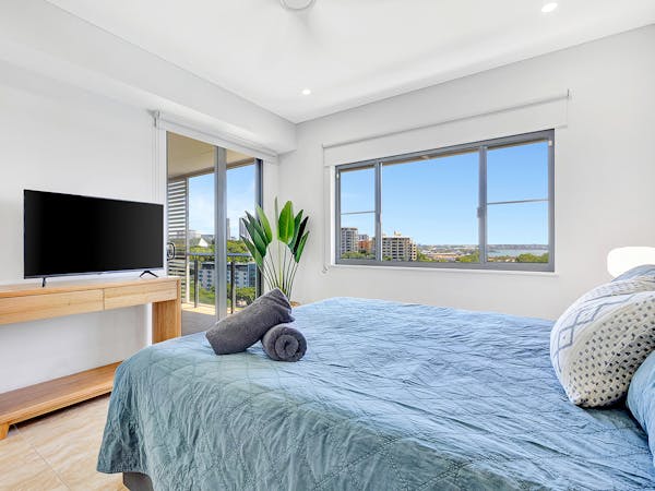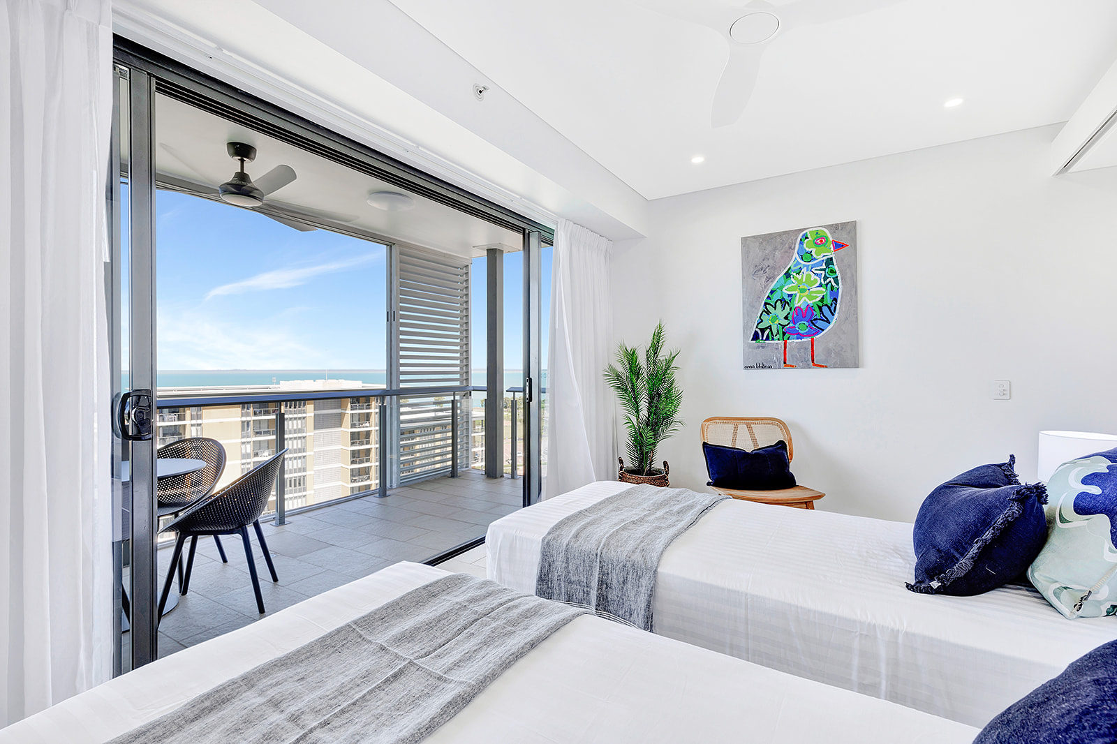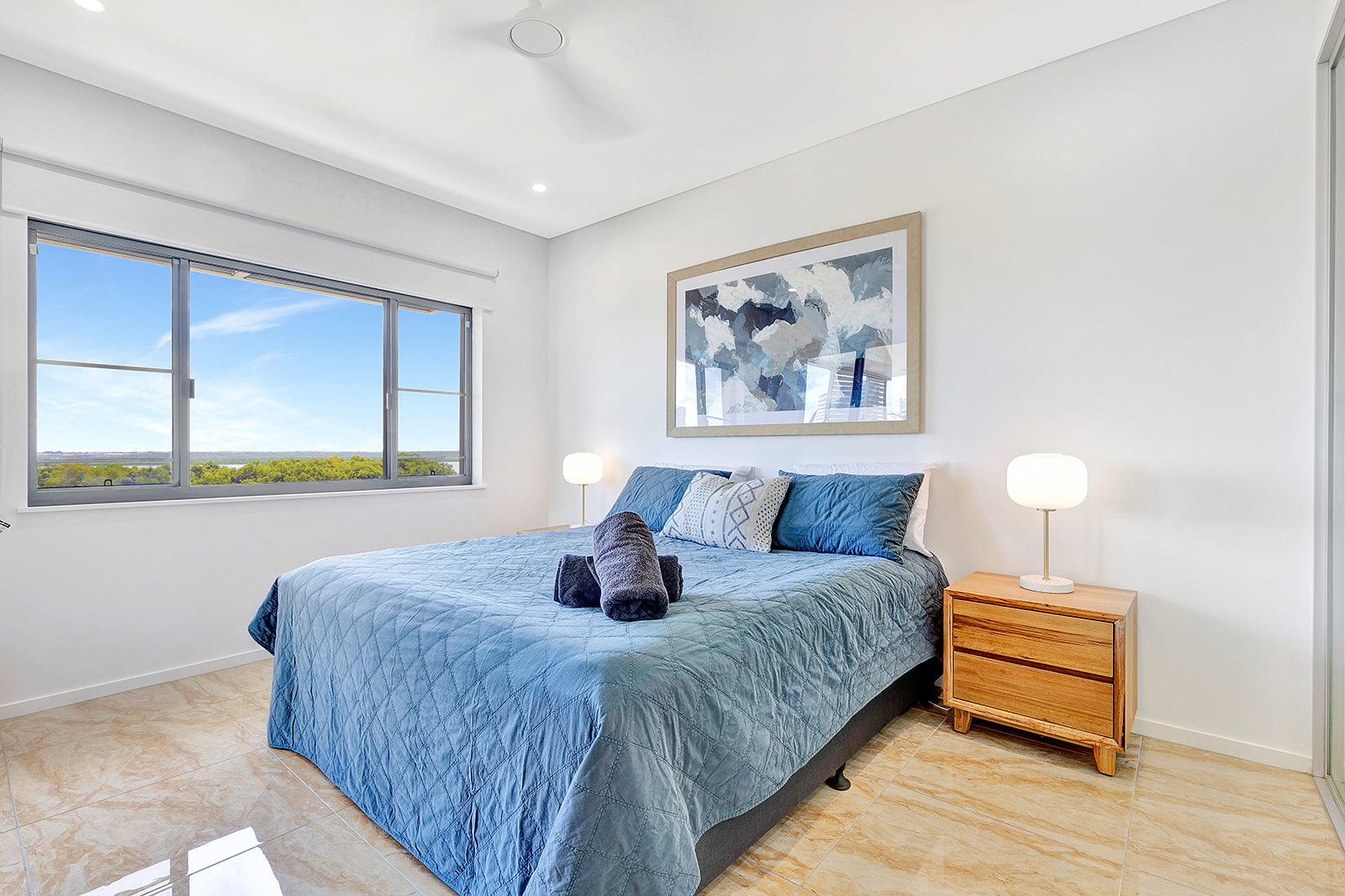 Located on the 7th floor offering 270-degree views over the Darwin Waterfront and the ocean as far as the eye can see. Upon entry the apartment opens to an elegant open-plan kitchen, dining, and lounge area with access to the fabulous breezy balcony and BBQ. The master bedroom enjoys these same views and includes queen bed, 2 x built-in robes, TV, private ensuite bathroom and sliding door to the balcony. The second bedroom offers the option of I x king or 2 x single beds, built-in robe and is adjacent to the second bathroom. An additional double sofa bed is available in the lounge. A separate laundry area, secure access and undercover secure parking completes the apartment.