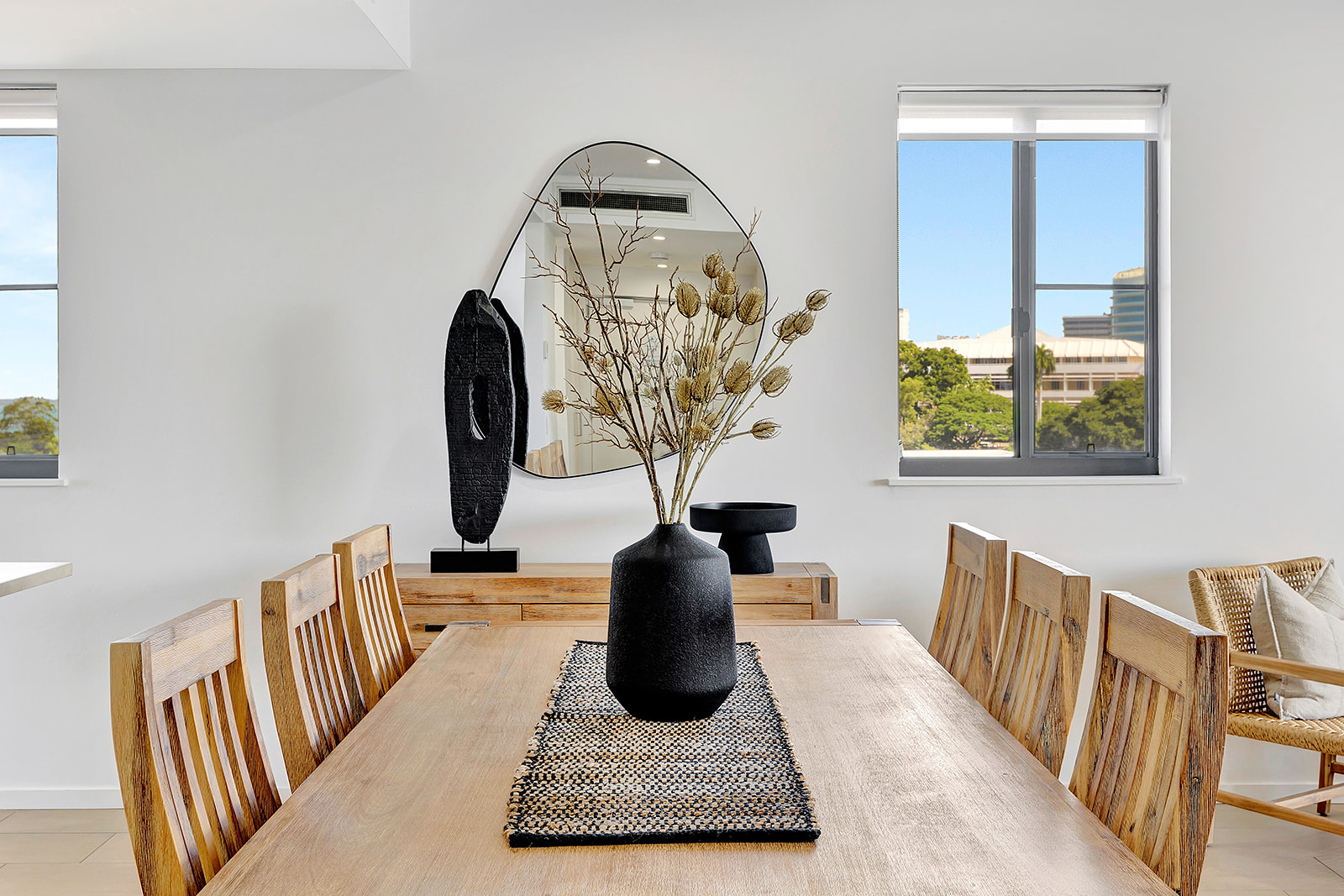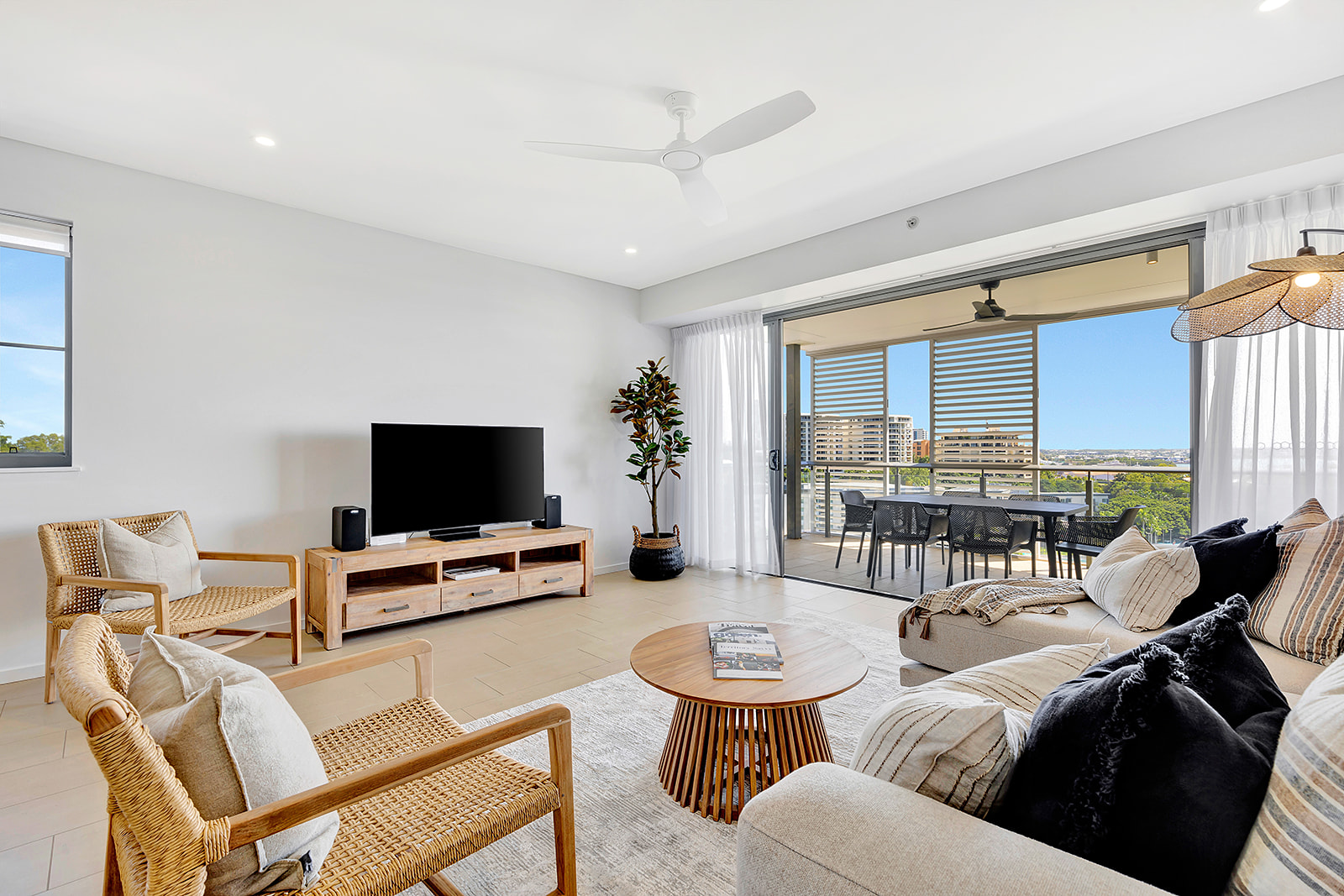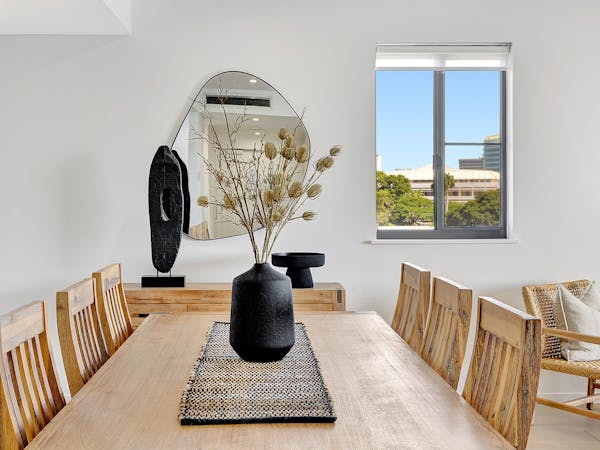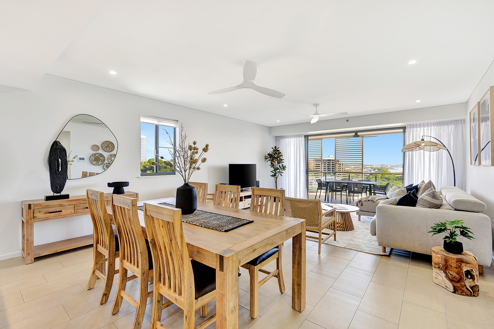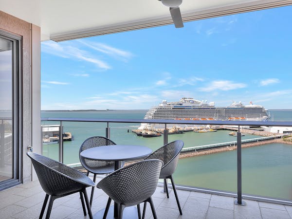 Located on the 7th floor offering 270-degree views over the Darwin Waterfront and the ocean as far as the eye can see. Upon entry the apartment opens to an elegant open-plan kitchen, dining, and lounge area with access to the fabulous breezy balcony and BBQ. The master bedroom enjoys these same views and includes queen bed, 2 x built-in robes, TV, private ensuite bathroom and sliding door to the balcony. The second bedroom offers the option of I x king or 2 x single beds, built-in robe and is adjacent to the second bathroom. An additional double sofa bed is available in the lounge. A separate laundry area, secure access and undercover secure parking completes the apartment.