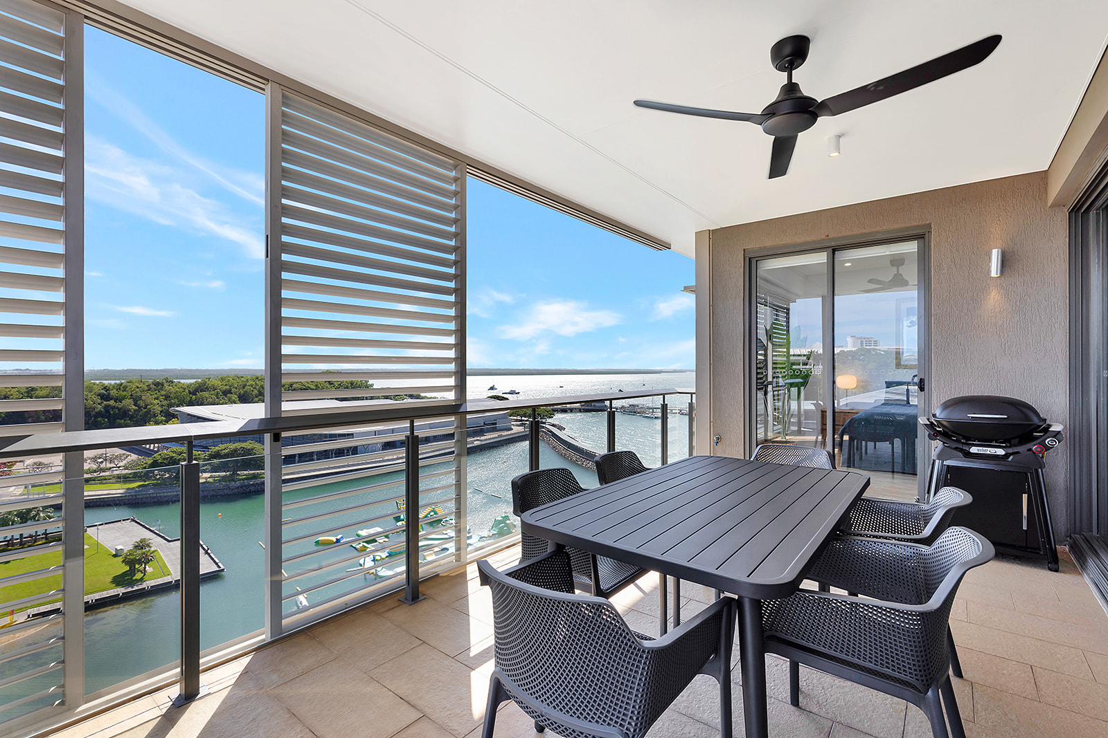 This penthouse apartment offers exceptional accommodation. The 350-degree views over the Darwin Waterfront, City, and the Ocean are breathtaking at any time of the day or night. Once inside, this 10th floor luxury 3 bedroom apartment opens up to an elegant open-plan living, dining and kitchen area that resides centrally to the home with the setting sun framed in the windows. The kitchen offers stone-topped counters, an island breakfast bar and is perfect for everyday dinners or entertaining in style. From the living areas, double opening doors showcase the balcony with views over the restaurant strip, the water park, Stokes Wharf and much more. The master bedroom suite includes TV, private ensuite and sliding door to the balcony. Bedrooms 2 and 3 both access the rear balcony with views over Stokes Wharf and Darwin harbour. All bedrooms can be made up as king beds or twin singles. A second bathroom includes a bath and separate shower. A laundry, secure access and undercover secure parking for two cars completes the apartment amenities.
